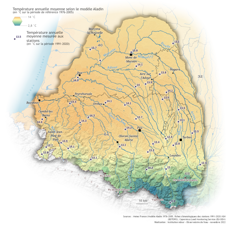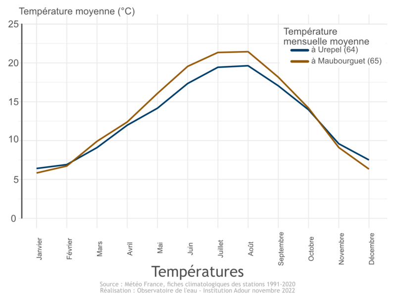 Avec 11,8 °C de température moyenne annuelle contre 10,6 °C pour la France métropolitaine, le bassin de l'Adour connaît des températures relativement douces mais celles-ci varient selon l'altitude.