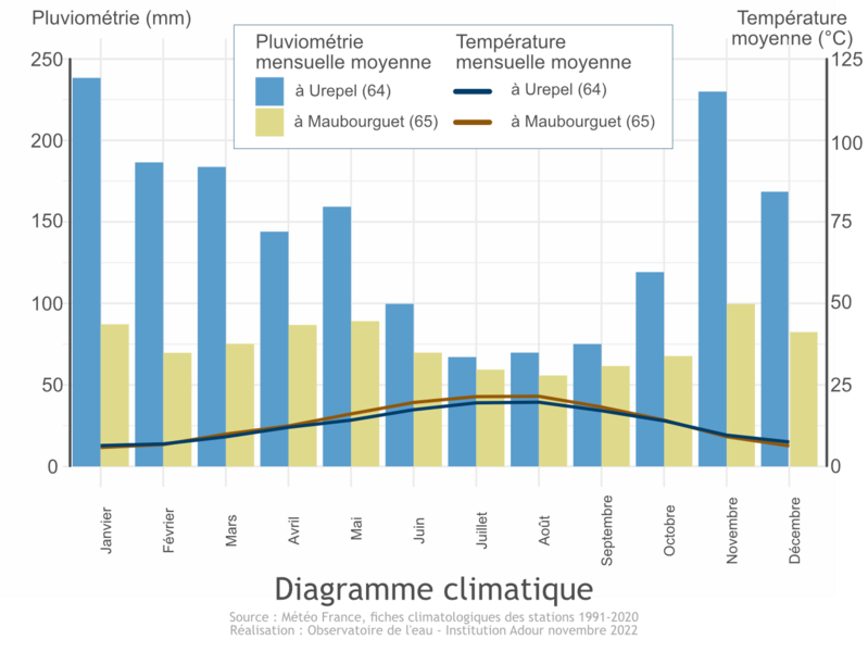 En ce qui concerne la répartition des précipitations au cours de l'année, les variations inter-mensuelles sont plus importantes à proximité de l'océan qu'à l'intérieur des terres, avec des précipitations plus fortes en hiver qu'en été (voir exemple des stations de mesures à Maubourguet et Urepel ci-dessous).