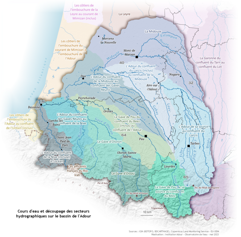 L’Adour est l'un des principaux fleuves de France. Son bassin versant, c’est-à-dire l’ensemble du territoire délimité par des lignes de crête où toutes les eaux reçues se concentreront vers l’exutoire de l’Adour, s’étend sur près de 17 000 km2. Au sein de ce vaste territoire, on recense un réseau hydrographique superficiel dense, constitué de cours d’eau, tous affluents de l’Adour, et de lacs. Ces entités hydrographiques sont affiliées à des masses d’eau, découpages territoriaux élémentaires des milieux aquatiques destinés à constituer l’unité d’évaluation de la directive cadre européenne sur l’eau (DCE).