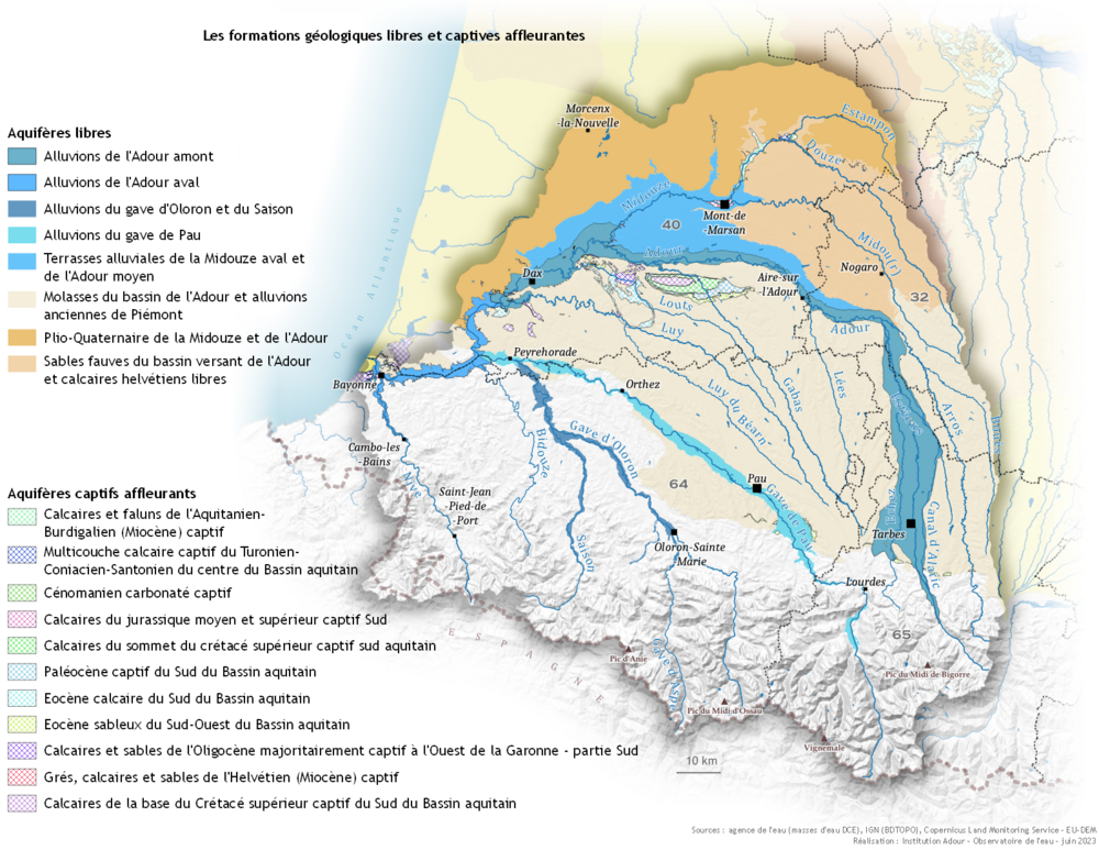 D’un point de vue géologique, le bassin de l'Adour est couvert aux deux tiers par le bassin aquitain, deuxième plus grand bassin sédimentaire de France. Il est délimité par l’océan Atlantique, les Pyrénées, et s’étend jusqu’aux massifs central et armoricain. Il est caractérisé par une succession de couches sédimentaires constituées au fil des ans. Certaines de ces couches sont constituées de roches perméables contenant de l’eau, c’est-à-dire des aquifères. Ces derniers font partie intégrante du bassin de l’Adour et constituent un autre aspect de la ressource en eau. Certaines de ces ressources sont exploitées (alimentation en eau potable, thermalisme, agriculture, industrie).