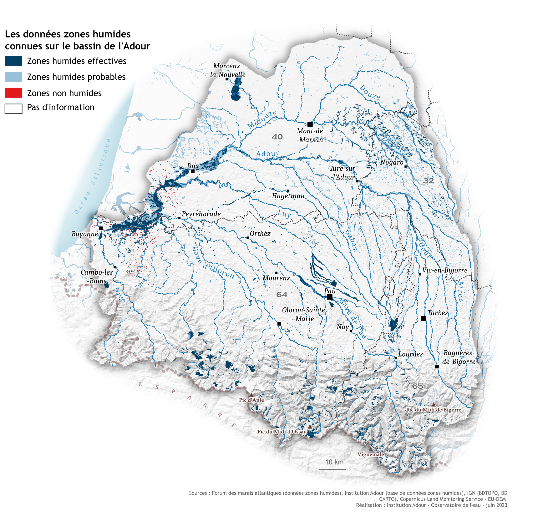 L’Institution Adour dispose d’une base de données recensant les zones humides connues sur le bassin de l’Adour (cf. carte). Ces données sont disponibles à la demande (demander les données). De même, le Forum des Marais Atlantiques qui constitue le pôle-relais zones humides à l’échelle de l’Atlantique, met à disposition des données et peut accompagner les collectivités dans leurs démarches d’identification et de préservation des zones humides.