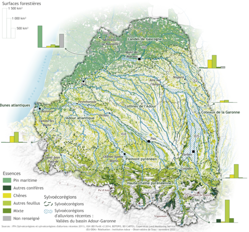 Les essences d'arbres dominantes dans les forêts du bassin de l'Adour sont le pin maritime et le chêne mais les forêts ne sont pas uniformes sur le territoire. Différentes sylvo-écorégions permettent de caractériser les zones boisées. En plaine (sylvo-écorégions des collines de l'Adour et de l'Adour atlantique) ce sont les feuillus qui dominent alors que dans les zones montagneuses (sylvo-écorégions du piémont et de la haute-chaîne pyrénéenne), on trouve un mélange de feuillus et de conifères, en fonction de l'altitude et des conditions locales. Les landes de Gascogne, elles, se distinguent par une forte présence de sylviculture du pin maritime dans des forêts privées. Le département des Landes est d'ailleurs le premier département de France métropolitaine pour le volume de bois produit (source : Agreste - EXFNR - 2016-2020).