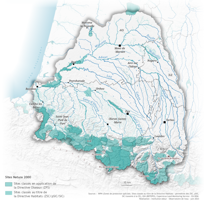 Parmi les divers milieux présents dans le bassin de l'Adour, le réseau Natura 2000 protège des milieux patrimoniaux définis par la faune et la flore d'intérêt qu'ils abritent et recouvre notamment la zone pyrénéenne, certains cours d'eau et leurs abords.