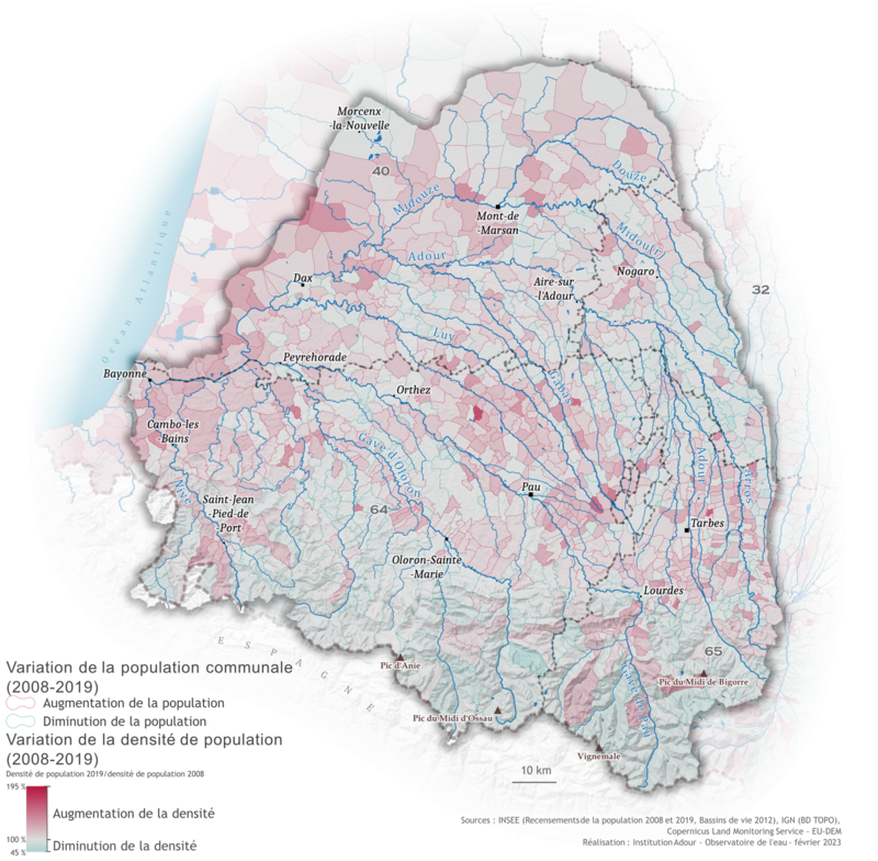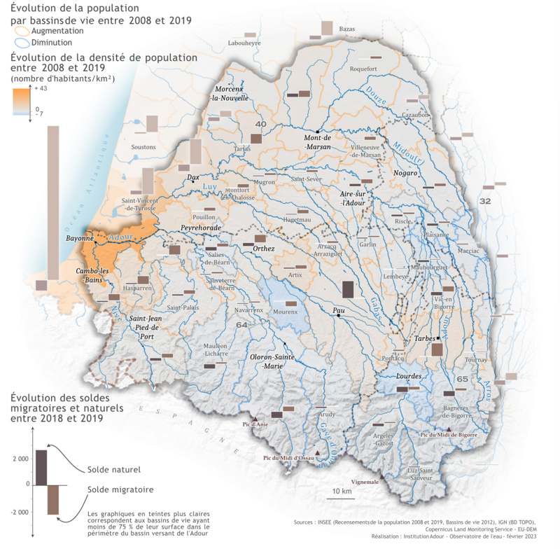 Si l’on considère la démographie par bassins de vie, on remarque que sur la période 2008-2019, l’augmentation de la population est essentiellement liée au solde migratoire, particulièrement fort dans l’ouest du bassin de l’Adour. Certains bassins situés en zone montagneuse et dans la partie gersoise du territoire voient quant à eux leur population diminuer.