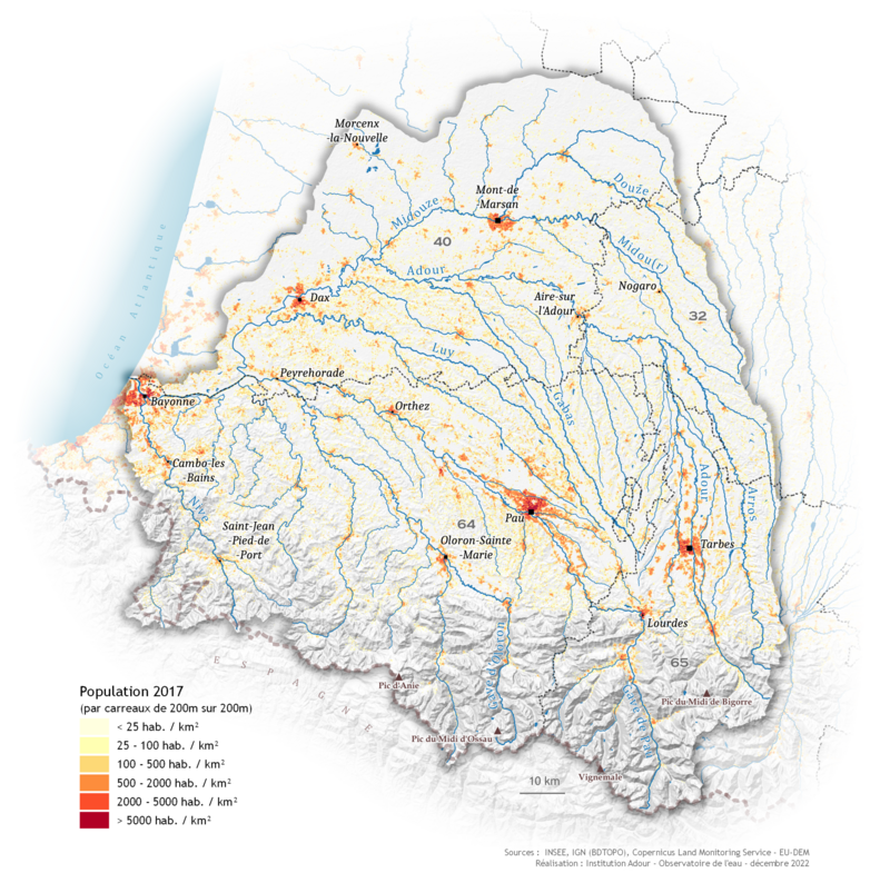 En 2022, la population des communes du bassin de l’Adour est estimée à 1 078 000 habitants. Sa densité de population moyenne (64 habitants par km²), similaire à celle du bassin-Adour-Garonne (68 hab./km²), est très inférieure à la moyenne nationale (107 hab./km²).
