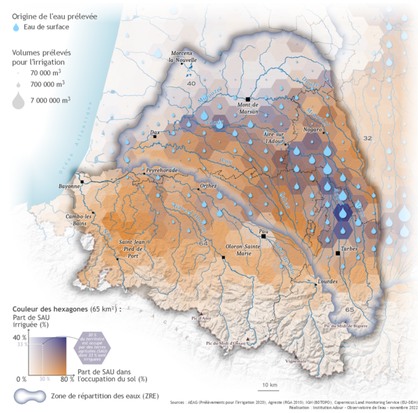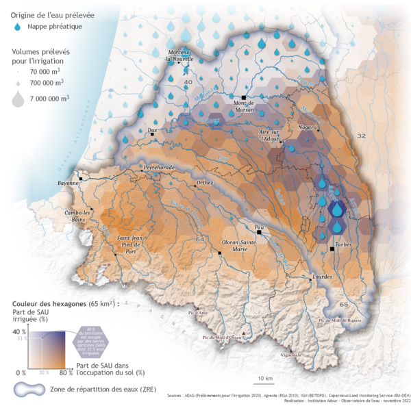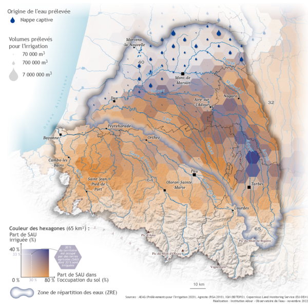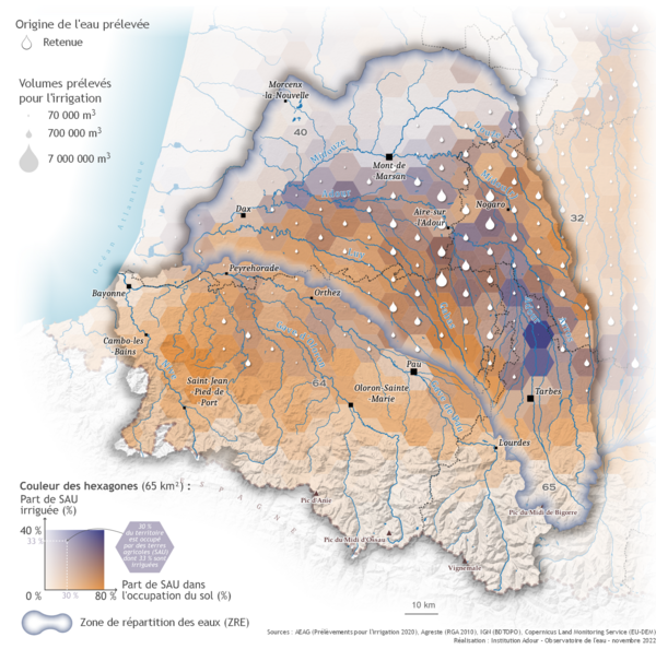 En 2020, les prélèvements pour l'agriculture sur le bassin de l'Adour représentent 214 millions de m3 soit 58 % des prélèvements. Pour le bassin Adour-Garonne, cet usage représente 47 % des prélèvements (945 millions de m3). En France, c'est 29 % des prélèvements qui sont destinés à l'irrigation (3 475 millions de m3).