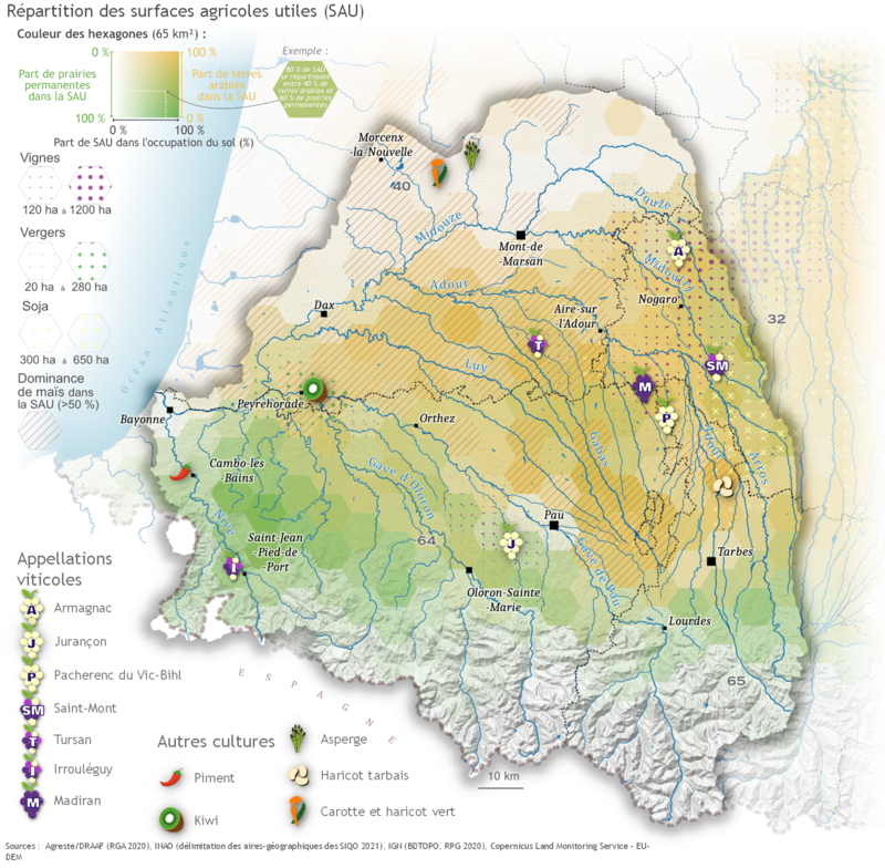 Les surfaces agricoles, réparties de manière hétérogène dans le bassin, se retrouvent surtout en dehors des zones de haute montagne et de terres sableuses des Landes.
