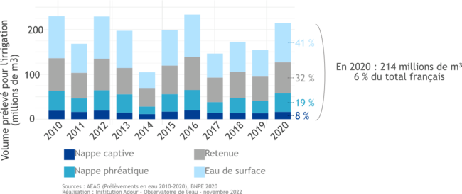 Le volume prélevé pour l’irrigation varie d’une année sur l’autre, au gré des conditions météorologiques. En 2020, il a été estimé à 214 millions de m3, sur la base des prélèvements supérieurs à 7 000 m3/an, les autres n’étant pas comptabilisés.
