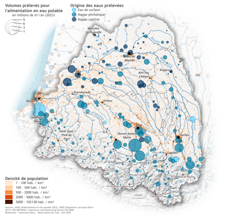 En 2020, les prélèvements pour l'alimentation en eau potable sur le bassin de l'Adour représentent 117 millions de m3 soit 32 % des prélèvements. Pour le bassin Adour-Garonne, l'alimentation en eau potable représente 37 % des prélèvements (739 millions de m3). En France, elle représente 48 % des prélèvements (5 673 millions de m3).