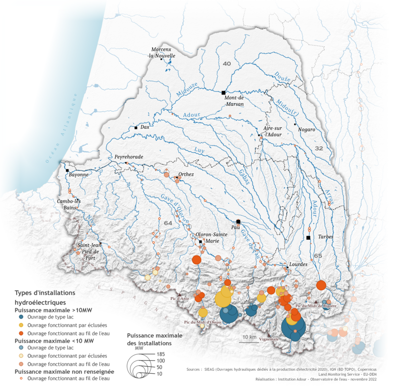 La production électrique provient du bilan des redevances pour les ouvrages en rivière 2018, publié par l'agence de l'eau Adour-Garonne en 2020.