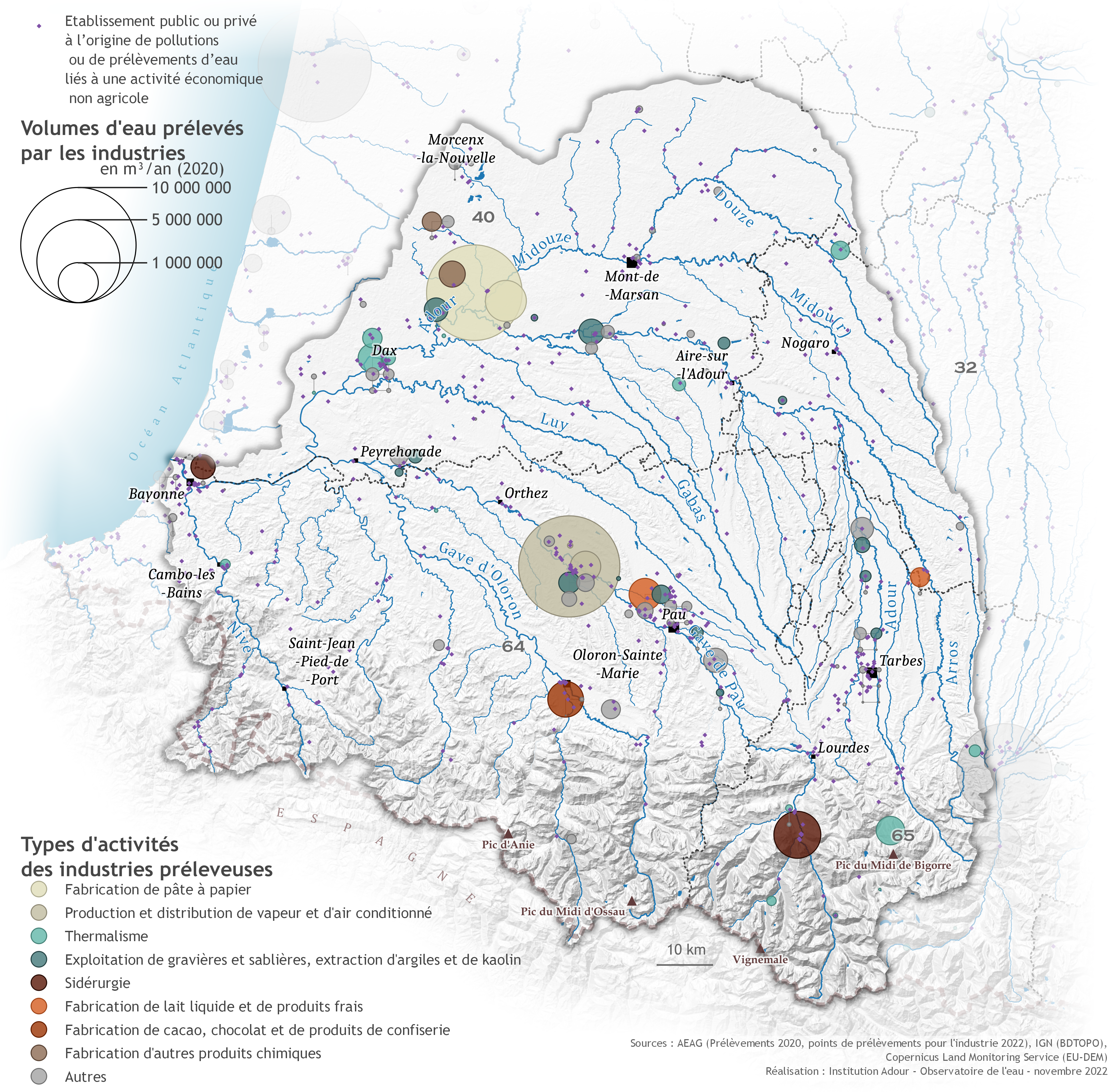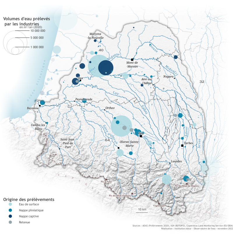 En 2020, les prélèvements pour l'industrie sur le bassin de l'Adour représentent 36 millions de m3 soit 10 % des prélèvements. Pour le bassin Adour-Garonne, 17 % des prélèvements (339 millions de m3) sont destinés aux industries. En France, cet usage concerne 23 % des volumes prélevés (2 748 millions de m3).